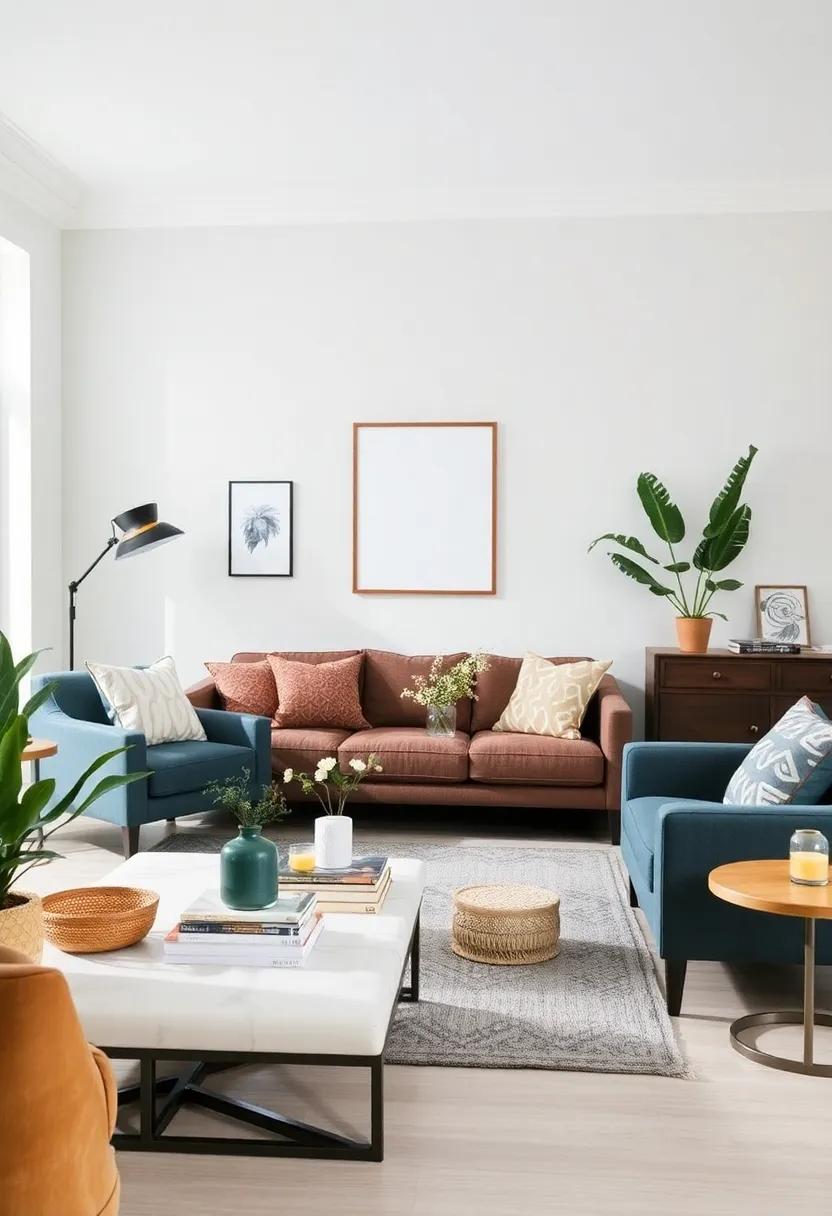 | Accent Chairs | Combine a sleek mid-century chair with a plush, colorful armchair. |