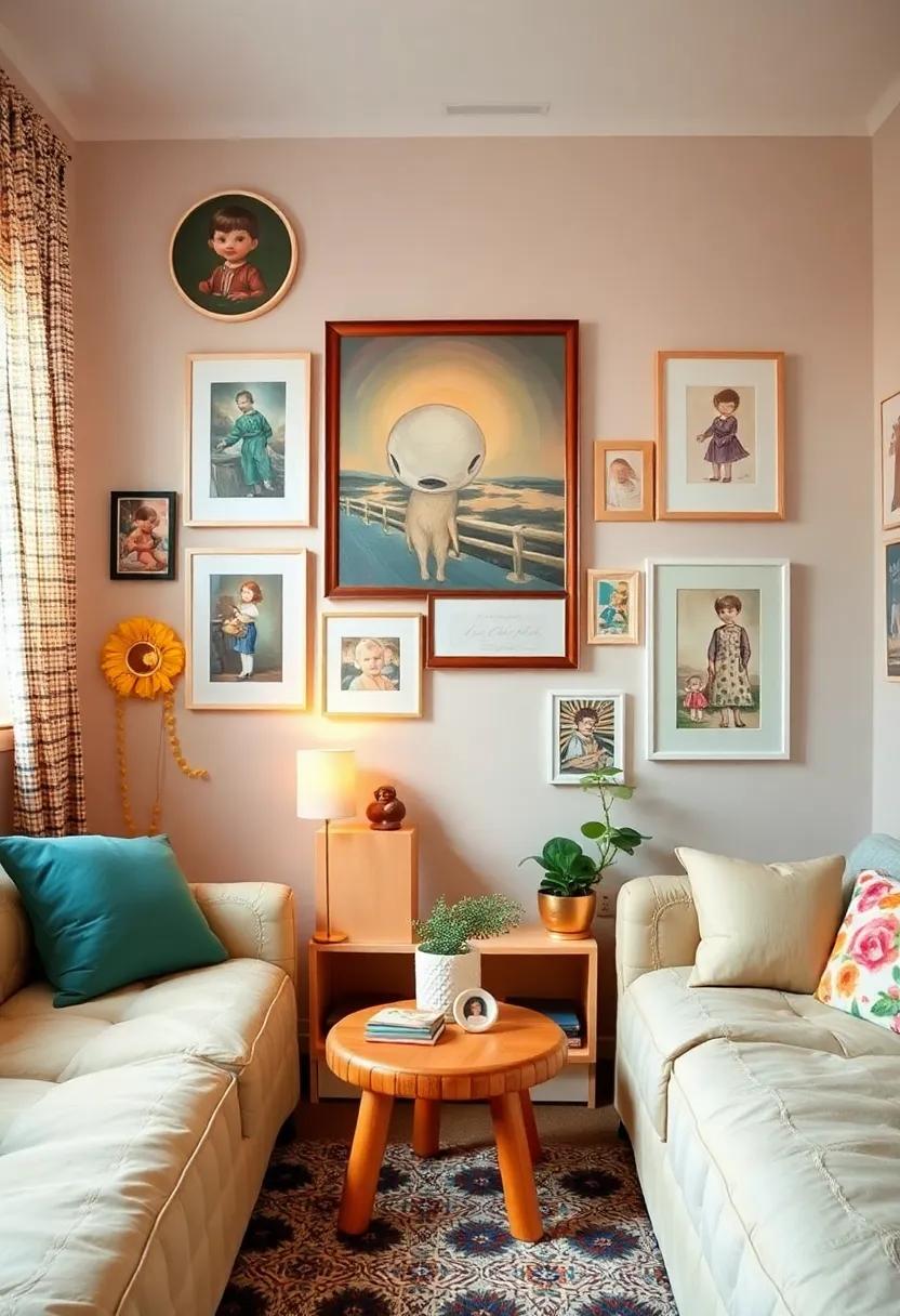 When arranging your artwork, think about layering different styles and sizes to achieve depth and character. Integrate soft pastels with vivid watercolor designs or combine black-and-white sketches with colorful prints to create a dynamic visual experience. To further enhance the nostalgic ambiance, you might consider adding a small table featuring a curated selection of classic books alongside a few cherished toys or collectibles. Here’s a simple table outlining the types of wall art you can incorporate: