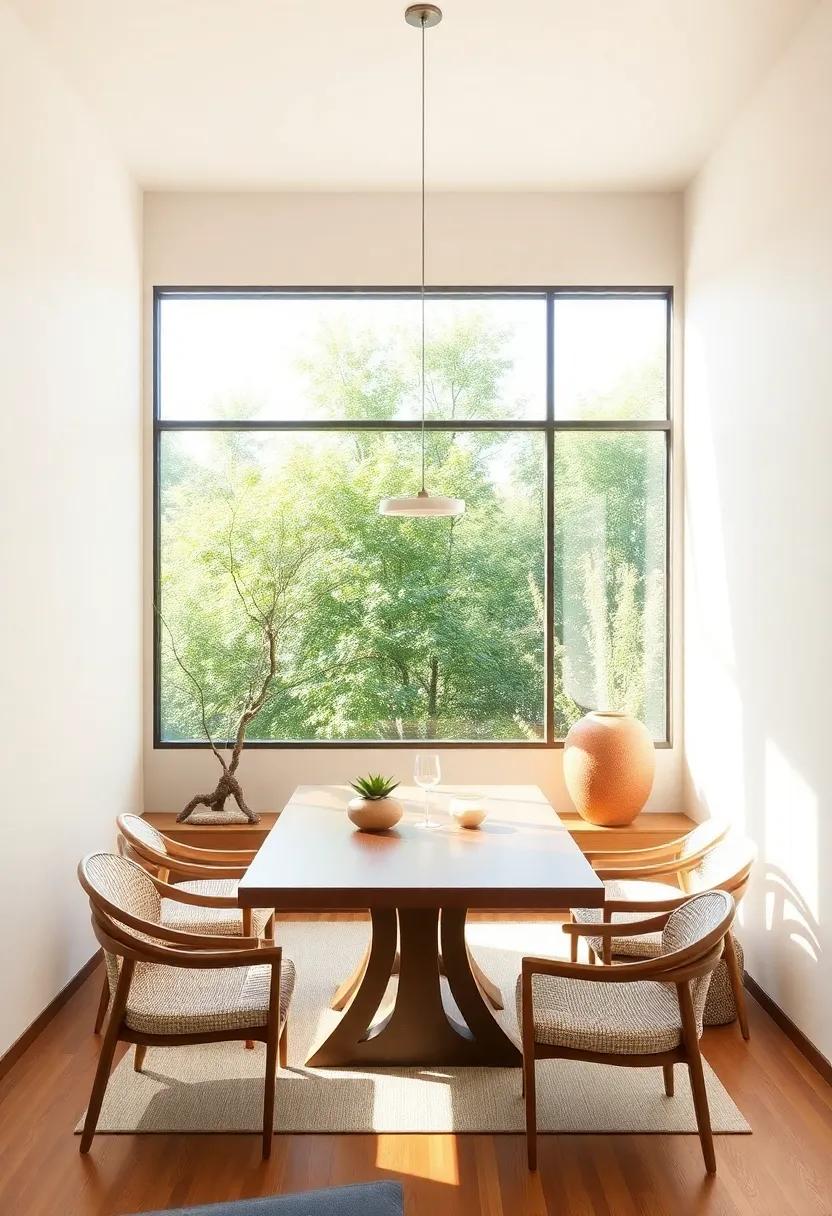 A harmonious blend of indoor plants and natural textures can complement your views, making the dining area feel like an extension of the outdoors. Aim for a balance of elements that evoke calmness; using organic materials such as bamboo, stone, and wood provides a tactile experience that engages with the senses. You might also incorporate minimalist decor that encourages mindfulness and promotes tranquility. To further optimize your space, explore the following ideas: