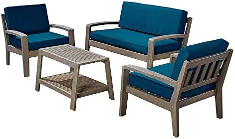 This four-piece chat set presents a delightful solution for those seeking comfort and style in outdoor spaces. Crafted from sturdy acacia wood, the furniture is designed to withstand the elements while offering a modern aesthetic. The set includes a loveseat, two club chairs, and a practical coffee table, making it versatile enough for various outdoor settings. The thick, plush teal cushions provide a welcoming contrast to the gray finish, allowing for cozy conversations, reading, or simply enjoying the sunshine. With easy maintenance in mind, the materials used are water-resistant, though it’s wise to store the cushions when not in use to prolong their life.