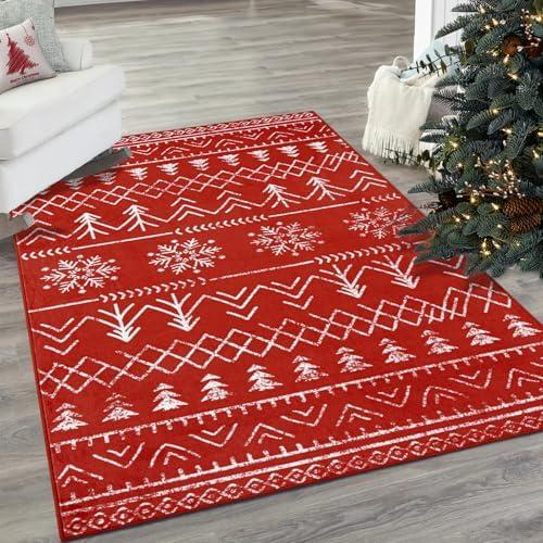 Festive Red Rug with Christmas Patterns and Non-Slip Features for Home Decor