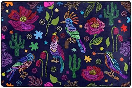 The area rug features an eye-catching design of colorful tropical birds and flowers set against a navy background, making it a decorative addition to any space. Measuring 2 x 3 feet, the rug is perfect for enhancing the atmosphere of your living room, bedroom, or kitchen. It is constructed from high-quality polyester and includes a non-woven and dot plastic backing for durability and stability. The middle interlayer is made of high-density memory sponge, providing comfort by alleviating the pressure of footsteps. With its soft texture and ability to absorb water quickly, this rug is not only aesthetically pleasing but also functional for everyday use.