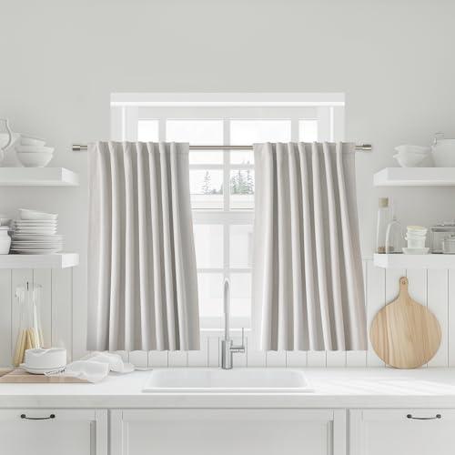 The curtains feature a sophisticated design that makes them suitable for various settings, including kitchens, living rooms, and bedrooms. With their versatile hanging methods, you can easily customize their appearance to match your decor. They are made from a linen blend that not only ensures a perfect blackout effect but also helps shield your furniture from harmful sun rays. The dimensions of each panel measure 50 inches wide by 45 inches long, providing ample coverage for small windows while creating a dark, serene environment ideal for sleep or relaxation.