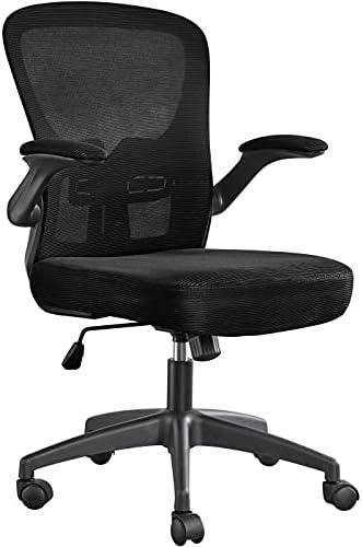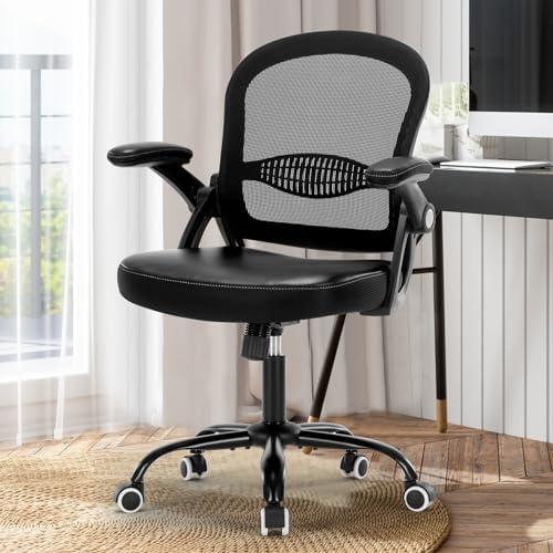This chair features breathable mesh for excellent airflow, keeping you comfortable even during long hours of work. The 2.8-inch thick PU leather seat cushion and high-density mesh backrest offer great support and elasticity without deforming over time. The 90-degree flip-up armrests are a notable design choice, allowing for convenient storage under your desk and promoting space-saving. Coupled with a pneumatic lift for height adjustment and a tilt mechanism for reclining, this chair adapts easily to your comfort needs, helping to maintain correct posture and reduce discomfort from prolonged sitting.