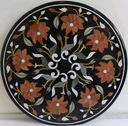 This stunning round table top, crafted from natural Indian black Makrana marble, features intricate floral inlay designs made with semi-precious stones. Measuring 36 inches by 36 inches, it is suitable for various uses, enhancing the visual appeal of your home decor. Ideal for both indoor and outdoor settings, this piece can serve as a dining table, patio table, side table, or center table in living areas. Its handmade craftsmanship reflects a remarkable attention to detail and artistry, making it not just a functional item but also a beautiful work of art that sparks conversation.