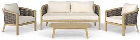 Transform your outdoor space into a cozy retreat with this stylish seating collection. This set includes a generous patio sofa, two comfortable conversation chairs, and a spacious coffee table, all crafted from solid acacia wood and weather-resistant materials. The deep seats and extra-thick cushions ensure that long conversations under the stars remain enjoyable. The coffee table’s ample rectangular surface is perfect for drinks, snacks, and all the little things that make outdoor living an experience. The natural polyester fabric adds an inviting touch that blends seamlessly with any outdoor décor.
