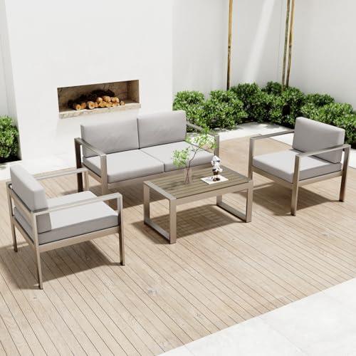 Experience a blend of style and function with this 4-piece patio lounge set, thoughtfully designed for outdoor comfort. The set includes a modern sofa, loveseat, and two armchairs, all featuring plush cushions upholstered in a chic gray fabric that enhances outdoor aesthetics. The elegant coffee table, crafted to resemble wood, adds a touch of natural charm while providing a perfect spot for beverages, books, or decorative items. Composed of high-quality, powder-coated aluminum, this furniture is built to endure various weather conditions, ensuring that it remains a staple of your outdoor sanctuary through seasons.