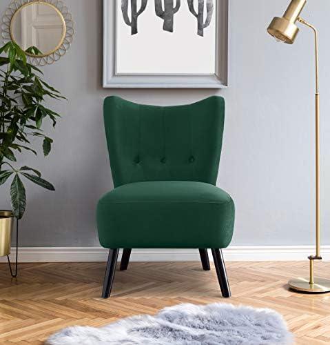 This accent chair brings a touch of elegance to any living space with its stunning green velvet upholstery and retro aesthetic. The combination of a sturdy wooden frame and the striking brown finished rubberwood legs adds visual appeal and durability. The foam boxed pocket coil cushion provides a perfect balance of support and comfort, making it an ideal seating option for relaxing moments or social gatherings. Measuring at 22.5″ in seat width and 18.5″ for both seat height and depth, it fits well within smaller or larger areas alike.