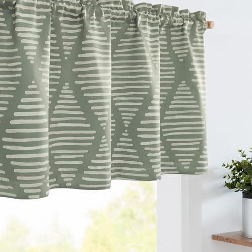 This beautifully designed window treatment features a stylish geometric print complemented by a soothing sage green color, making it a perfect fit for various home aesthetics such as boho, farmhouse, or modern country. The fabric is substantial and incorporates blackout yarn, effectively filtering harsh sunlight while maintaining just the right amount of privacy. Measuring 50 inches in width and 18 inches in length with a convenient 2-inch pole pocket, this valance is easy to install on cafe curtain rods making it ideal for kitchens, living rooms, bathrooms, and more. The combination of its soft touch fabric and elegant design creates a cozy atmosphere, ideal for enhancing your rooms this spring.