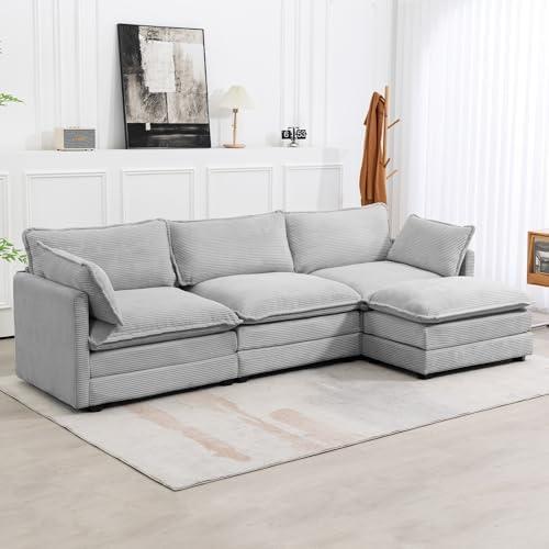 This oversized modular sectional sofa is designed to enhance your living space with its elegant light grey corduroy fabric that brings a modern touch to any room. The piece offers spacious seating with dimensions of 112.2″W x 34.3″D x 33.5″H, allowing for ample room to comfortably accommodate up to four people. The double-layer thickened cushions filled with high-density sponge ensure long-lasting comfort and avoid sagging over time, making it suitable for extended seating. Additionally, the convertible chaise feature allows for customization, as the movable ottoman can be rearranged to suit your space and preferences.