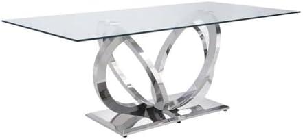 This elegantly designed piece is perfect for those looking to elevate their dining experience. Featuring a clear glass top that allows natural light to enhance the ambiance of your dining area, its unique stainless steel base showcases four interlaced spinning circles, adding a touch of visual intrigue. This table effortlessly complements various dinnerware styles and home décor, making it a stunning focal point for gatherings with family and friends. The modern design and reflective surface ensure it fits seamlessly into a contemporary or casual setting.