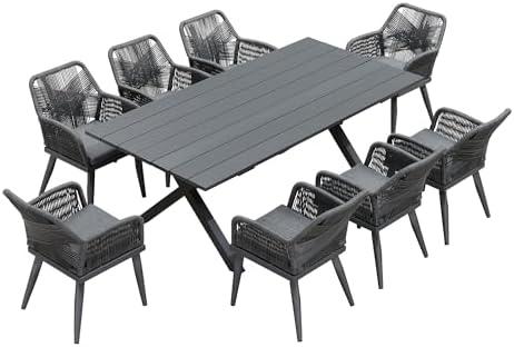 Crafted for both style and longevity, this outdoor dining set features an intricately woven PE rattan backrest that enhances visual appeal while ensuring durable performance. Sturdy and lightweight aluminum frames provide exceptional stability, making it an ideal choice for various outdoor environments such as backyards, balconies, and poolside settings. With generous dimensions, including an 80.70″ x 60.83″ rectangular table and 8 comfortably sized chairs, this ensemble invites you and your guests to enjoy memorable gatherings.