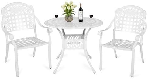 This outdoor furniture set is crafted from durable cast aluminum, ensuring it withstands various weather conditions while maintaining an elegant appearance. The rust-resistant powder-coated surface not only makes the set easy to maintain but also adds longevity, making it ideal for outdoor use near pools, patios, or gardens. Each chair features a vintage floral design and ergonomic contours that provide exceptional comfort and style. A 2″ umbrella hole at the center of the table allows for convenient shade whenever needed, making it versatile for both sunny and rainy days.