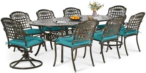 This outdoor dining set is crafted from cast aluminum, ensuring outstanding durability and resistance to rust, weather, fade, and cracking. The 84″ oval table is complemented by six stationary chairs and two swivel rockers, providing ample seating for family and guests. Each component features a powder-coated surface, which not only enhances its aesthetic appeal but also simplifies maintenance—just a dry or damp cloth is needed for cleaning. Moreover, the inclusion of adjustable foot levelers allows for a stable dining experience even on uneven surfaces. An umbrella hole in the center of the table adds to its practicality, enabling shade options during sunny days (umbrella not included).