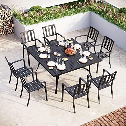 This outdoor dining set features a generous 60″ square table accompanied by eight stackable metal chairs, making it an ideal choice for family gatherings and outdoor entertaining. The sleek design not only complements various patio decors but also provides ample space for food and beverages. The table’s straight legs ensure easy chair movement, promoting a comfortable dining experience. With a weight capacity of 300 lbs for both the table and chairs, durability is a priority, while the umbrella hole accommodates sun protection effortlessly.