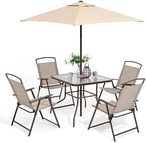 6 Pieces ⁣Folding Patio Dining Set, All Weather Small Metal Outdoor Garden Patio Furniture Set‌ w/Umbrella, Glass Table &⁢ 4 Folding Chair for Lawn, Deck, Backyard, Beige