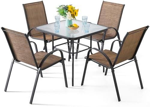 NUU GARDEN 5 Piece Outdoor Dining Set, 4 All Weather Outdoor Textilene Patio Chairs ⁢and⁤ 32″ Square Tempered Glass Dining Table with 1.97″ Umbrella Hole, for Backyard, Patio, Garden, Brown⁣ and Black