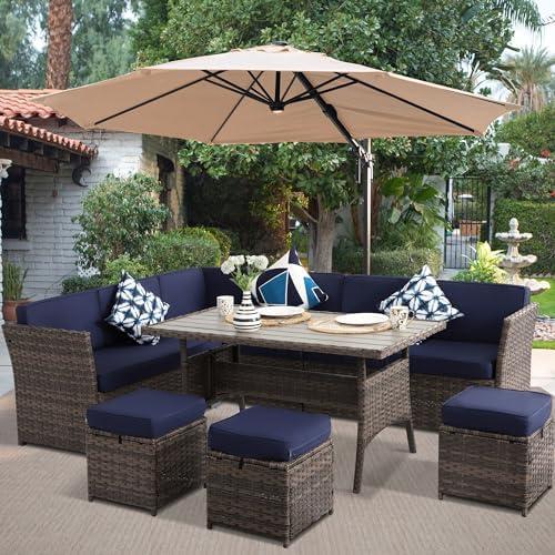 Outdoor Patio Furniture Set,7 Pieces Outdoor Sectional Conversation Sofa with Dining Table,Chairs and Ottomans,All​ Weather PE Rattan and Steel Frame,with Backrest and Removable Cushions(Grey+Blue)