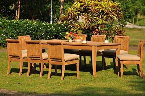 This dining set prominently features a very large rectangular table that boasts double extensions, allowing for accommodating more guests effortlessly. The Grade A teak wood construction ensures durability and strength while enhancing the aesthetics of any outdoor or indoor space. Accompanied by eight armless chairs, this ensemble promises a comfortable dining experience, making it perfect for family gatherings or entertaining guests. The convenience of an included wood umbrella hole plug means you can create a shaded oasis easily, while the 2-inch umbrella hole allows for versatility (umbrella not included). Minimal assembly is required, ensuring a hassle-free setup right out of the box.