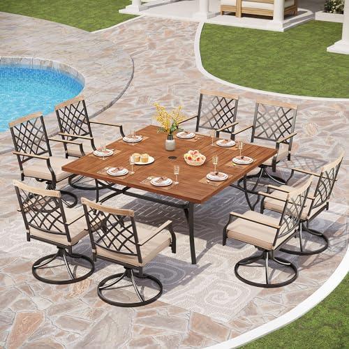 This outdoor dining set combines functionality with contemporary design, featuring a spacious 60″ rectangular metal table with an attractive woodgrain finish. The table is complemented by eight cushioned swivel dining chairs, each designed to provide comfort and versatility with a 360-degree rotation function. The robust frame ensures durability, making it suitable for various outdoor settings such as patios, gardens, and porches. The adjustable umbrella hole adds convenience, allowing you to create shaded dining areas during sunny days. With generous dimensions for both the chairs and table, it can accommodate gatherings of family and friends seamlessly.