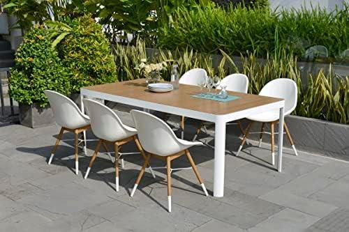 This elegant dining set is an ideal choice for enhancing your outdoor space, bringing a sophisticated touch to patios, backyards, and gardens. Featuring a blend of high-quality eucalyptus wood and virgin white resin, the furniture set offers both style and comfort. The table’s aluminum frame is coated in white and topped with Durawood® in a teak finish, ensuring it withstands seasonal weather changes, while the unique construction guarantees durability for years of outdoor enjoyment. The generous dimensions of the table (82L x 41W x 30H) and chairs make it suitable for gatherings of family and friends.