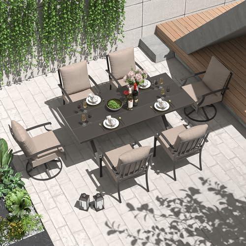 This 7-piece furniture collection is a fantastic blend of style and practicality, offering a comfortable dining experience in your backyard, garden, or poolside. The set includes four dining chairs and two swivel chairs, all equipped with cushions filled with 3.1 inches of foam for added comfort. The longboard metal dining table, measuring 78.7 inches by 35.4 inches, also features a 1.5-inch umbrella hole, allowing you to enjoy your meals while staying shaded from the sun. The robust metal frame is finished with a rust-resistant coating, ensuring durability and longevity even in outdoor conditions.