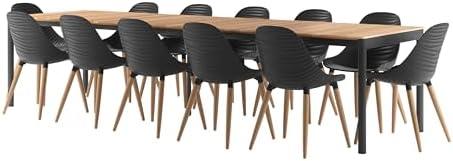 This stunning outdoor dining set features a rectangular table and seating for 12, designed for durability and style. Constructed with 100% FSC-certified teak wood from Indonesia, it showcases a rich golden-brown hue that gracefully weathers over time, enhancing its classic appeal. The set comes with a free maintenance kit that includes wood cleaner, a brush, gloves, and more, making it easy to keep your furniture looking its best. The chairs are crafted from recycled social plastic, ethically sourced and designed to provide comfort while supporting local communities through sustainable practices.