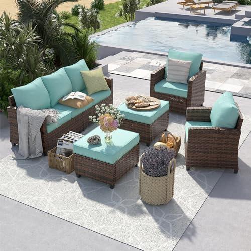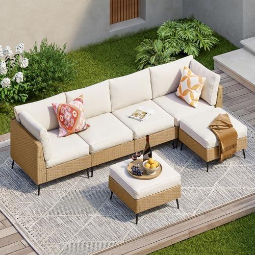 This versatile outdoor seating arrangement features a sectional design that allows you to configure the pieces to suit any space. Comprising two armless chairs, two corner chairs, and two ottomans, this set can be effortlessly reshaped to align with your patio or deck layout. The handcrafted rattan material not only enhances the aesthetic appeal but also ensures durability. With 5-inch thick seat cushions and 6-inch back pillows made from high-resilience sandwich sponge, the seating offers exceptional comfort for long hours of lounging.