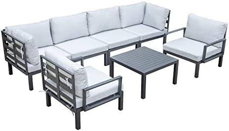 This charming outdoor furniture set is designed with versatility in mind, allowing you to create the perfect space for relaxation and socializing in your backyard. With its modular design, you can easily modify the arrangement to suit your preferences. The set comfortably accommodates 6-7 adults and includes two armchairs, two corner chairs, and two armless chairs, along with a coffee table, making it ideal for entertaining guests. The durable, powder-coated aluminum frame ensures resistance to rust, UV rays, and weather conditions, allowing for long-lasting enjoyment. Its strong and comfortable cushions, made from polyester and filled with foam, offer a pleasing seating experience under the sun.