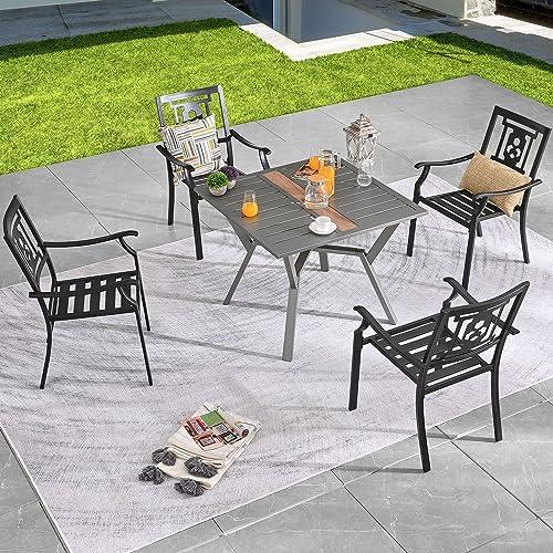The outdoor dining set features a robust and stylish design, ideal for enhancing your garden, backyard, or patio space. Constructed from powder-coated steel, the set comprises four stackable chairs and a square dining table, measuring 36″ x 36″. This combination not only provides ample seating space but also includes an umbrella hole that accommodates poles up to 2.1 inches in diameter, making it perfect for those sunny days. The lightweight chairs are designed for easy stacking, offering convenience and space-saving benefits when not in use. Each component is crafted for durability, ensuring you can enjoy outdoor meals comfortably.
