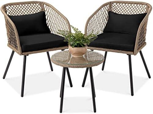This charming outdoor seating arrangement features a durable powder-coated steel frame wrapped in handwoven wicker, offering both style and stability. The set includes two chairs with generous dimensions and plush cushions that provide comfort for hours, making it ideal for relaxing on the patio or enjoying a meal on the balcony. The ergonomic design ensures a pleasant seating experience, complemented by an open weave that allows for a refreshing cross breeze. The included side table, featuring a textured tempered glass top, adds a sophisticated touch and holds up to 50 pounds, perfect for placing drinks or snacks.
