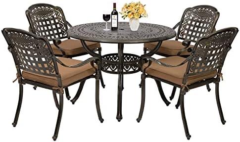 This outdoor furniture set combines durability and style, perfect for enhancing your patio, garden, or deck. Constructed from all-weather cast aluminum, it is designed to withstand various weather conditions while providing a sophisticated retro pattern design. The round table features a convenient 2-inch umbrella hole in the center, allowing for the addition of a patio umbrella, which is essential for shade during sunny days or light rain. The set includes four cushioned dining chairs, designed with ergonomic armrests that ensure comfort, making it perfect for gatherings with family and friends or for enjoying a quiet afternoon reading.