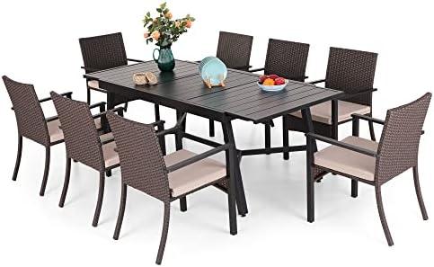 This stylish outdoor dining set combines comfort and functionality, featuring eight rattan wicker chairs and an expandable rectangular metal table. The chairs are crafted from durable PE rattan woven around a sturdy powder-coated steel frame, ensuring they can withstand various weather conditions while maintaining their elegance. Each chair includes a removable, water-resistant cushion that adds comfort for extended dining experiences. The table’s E-coating finish enhances its longevity and weather resistance, making it perfect for backyard barbecues or garden parties. The expandable design accommodates between six to eight people, making it an excellent option for family gatherings and celebrations.