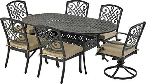 This versatile set includes luxurious Sunbrella Canvas Heather Beige cushions and features four armless dining chairs, two dining rockers, and a spacious 72″ x 42″ oval dining table. Crafted by a company known for its commitment to quality and comfort in outdoor furniture, this dining set brings a touch of sophistication to any patio or garden setting. The combination of seating options allows for easy movement and relaxing dining experiences, whether you’re hosting a barbecue or a sophisticated dinner party.