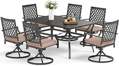 This outdoor furniture set combines functionality and style, featuring a large 60-inch rectangular metal table and six comfortable swivel chairs. Designed with a heavy-duty black steel frame and E-coating, it offers resistance to rust and corrosion, ensuring durability in various weather conditions. The table includes a 1.57-inch umbrella hole, perfect for providing shade on sunny days. Each swivel chair rotates 360 degrees and rocks slightly, enhancing the comfort experience for users. The weather-resistant cushions filled with high-density sponge add an extra layer of softness while being easy to clean, making maintenance effortless.