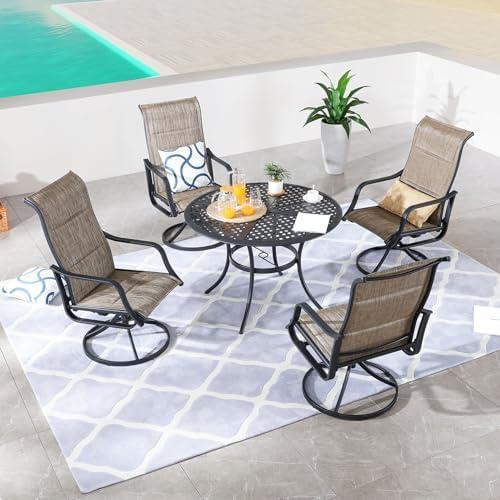 This outdoor dining set is perfect for those looking to enhance their patio space while providing comfort for up to four people. The set features a stylish metal table with a 42.1-inch diameter, complemented by four swivel chairs that add a dynamic element to any gathering. The diamond-shaped gaps in the table design not only contribute to its aesthetic appeal but also facilitate water drainage, preventing unsightly puddles after rain and ensuring a quick dry time. Constructed with high-quality materials, this set is built to withstand various weather conditions, making it a durable choice for long-term outdoor use.
