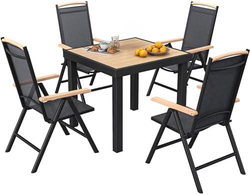 This folding outdoor dining arrangement offers a perfect blend of functionality and modern design, making it ideal for various outdoor spaces such as patios, backyards, and gardens. Crafted with a sturdy aluminum frame and a wood-like tabletop, it ensures durability while retaining a natural aesthetic. Each of the four sling-back chairs features an 8-position adjustable backrest, providing personalized comfort without needing assembly—just unfold and enjoy. The weather-resistant and rust-proof materials make it a low-maintenance option suitable for all climates, ensuring it remains a staple of your outdoor enjoyment for years to come.