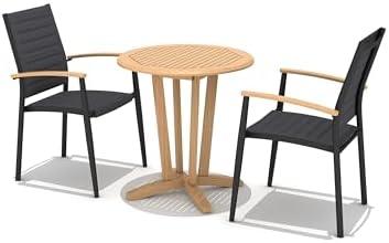 This outdoor furniture set is designed to enhance your patio with its elegant and eco-friendly materials. Crafted from 100% FSC certified teak wood, it ensures both durability and style without compromising your environmental values. With two comfortable chairs featuring 3D Weather-net material, users can enjoy a soft backrest while benefiting from UV protection and low maintenance. The included round bistro table provides the perfect spot for intimate dinners and morning coffee, making it an excellent addition to any outdoor retreat.