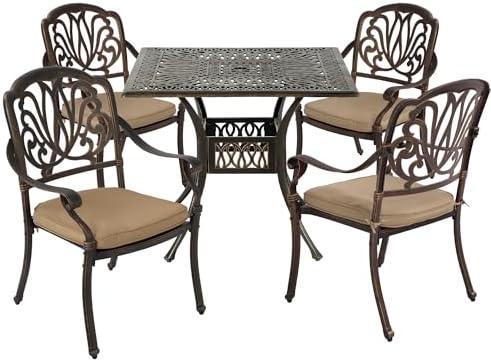 This beautifully crafted dining setup is made from cast aluminum, ensuring long-lasting durability that withstands the elements. The bronze powder coating enhances its resistance to rust and water, making it an excellent choice for outdoor use. The square table features a pre-cut umbrella hole perfect for providing shade during sunny days, easily accommodating most standard umbrellas. Furthermore, the adjustable screws on the feet help stabilize the table on uneven surfaces, minimizing wear and tear. With ample space designed for four, it makes family dinners or outdoor parties a breeze.