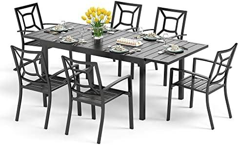 The outdoor dining experience is elevated with a well-crafted, expandable dining set that combines both functionality and style. The metal dining table, which can easily extend from 61 to 84 inches, comfortably accommodates between six to eight guests, making it a perfect choice for larger gatherings or cozy family dinners. Designed for durability, the table features a thick slat metal tabletop that resists rust, scratches, and weather, while the ergonomic steel chairs bring both comfort and stability, each supporting up to 300 lbs. The stacking feature of the chairs ensures easy storage, ideal for those with limited outdoor space.