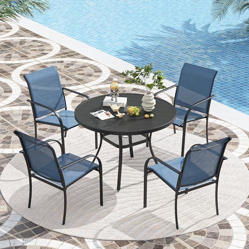 This outdoor dining set is both stylish and practical, featuring four stackable chairs and a round dining table. The chairs have a lightweight design, making them easy to move around, while their stackable feature allows for efficient storage when not in use, accommodating up to eight chairs stacked high. The sturdy powder-coated metal frame provides durability against various outdoor elements, ensuring longevity. Additionally, the table is equipped with an adjustable umbrella hole, making it versatile for use with different outdoor umbrellas to provide shade for your guests. Chair dimensions are 22.4″L x 20.5″W x 34.3″H, with a weight capacity of up to 250 lbs, and the table measures 41.7″ in diameter.