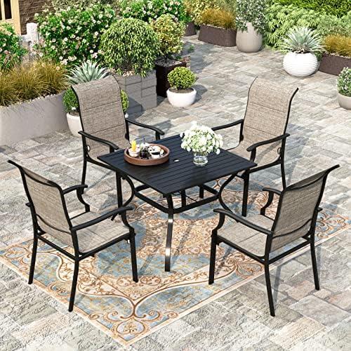 This outdoor dining arrangement features four padded dining chairs made with Textilene fabric, providing enhanced comfort through its ergonomic design and supportive neck and back features. The accompanying 37-inch square metal table boasts a slatted top with a pre-cut umbrella hole, making it suitable for a variety of outdoor settings, from backyard barbecues to poolside gatherings. The steel frame of the table and chairs is crafted with high-performance E-COATING and POWDER-COATING techniques, ensuring protection against rust, scratches, and UV damage, which is ideal for all-weather conditions.