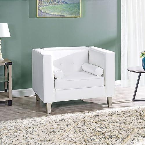 The rolled-arm chair offers a sophisticated design characterized by chic minimalism and luxurious comfort. Its button-tufted back and tapered square faux wooden legs provide an elegant aesthetic that fits seamlessly into various decor styles, including modern, traditional, and contemporary. Measuring 31.5” W x 33.9” D x 33.9” H, it serves as an ideal addition to both studio lofts and suburban homes. Equipped with thick, plush cushions, it promises a cozy seating experience, enhancing relaxation and socialization in your living space.