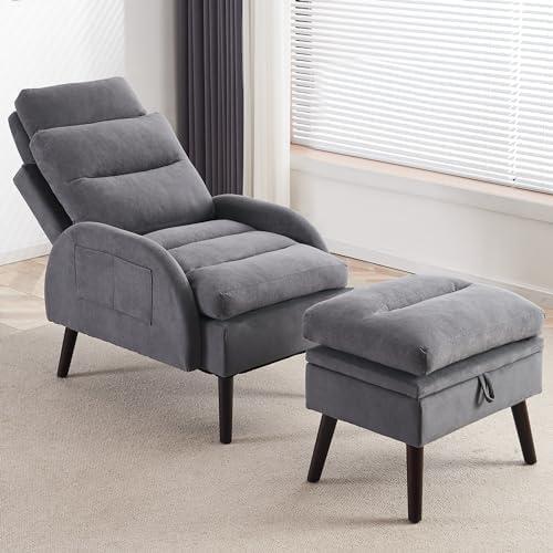 This stylish set is designed with your comfort in mind, featuring high elasticity foam padding that ensures a soft and inviting seating experience. The luxurious velvet upholstery elevates any space, whether it is your living room, bedroom, or office. The adjustable backrest can be set to three distinct angles (110°, 150°, and 180°), allowing you to tailor your position for reading, relaxing, or napping. Additionally, the ottoman doubles as a small table when needed, offering versatility and functionality without sacrificing aesthetics. Side pockets provide convenient storage for essentials like books and remote controls, making it practical for everyday use.
