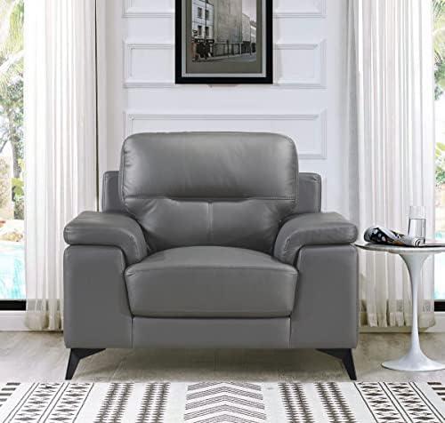 This dark gray chair elevates your living space with its modern contemporary design, featuring a sturdy wooden frame wrapped in sleek leather match. The combination of genuine cow leather and faux leather provides a sophisticated aesthetic, complemented by tufted accents that add visual interest. Comfort meets durability thanks to the foam cushioning and S-spring seat, making it an inviting spot for relaxation. With dimensions of 20.5″W x 22.5″D x 18.5″H, this chair is designed to fit a variety of living room layouts, while supporting up to 300 lbs.