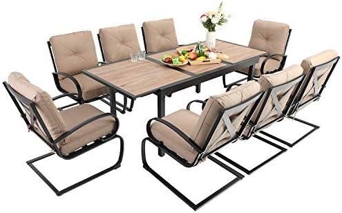 This exceptional outdoor dining set features an expandable table design that caters to various seating needs, accommodating between four to eight people with ease. Measuring 61.4″L x 37.4″W x 29.5″H when not expanded, it can be extended to 83.9″L, making it ideal for both intimate family meals and larger gatherings. The heavy-duty metal construction coated for rust and weather resistance ensures durability, allowing for years of outdoor enjoyment. Furthermore, the set includes eight spring motion chairs, designed with thick, cushioned seats for comfort and support, allowing you to relish your time outdoors.