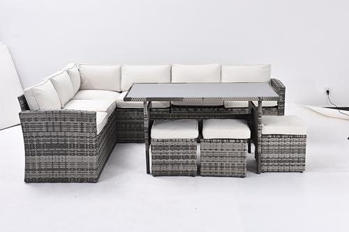 This outdoor furniture collection seamlessly combines style and functionality, making it a great addition to any garden or patio area. With its grey PE rattan and classy beige cushions, this set integrates smoothly into diverse landscapes, accommodating up to nine people. The spacious rectangular glass-top table offers ample room for dining or entertaining, while the three cushioned footstools can conveniently slide under the table, enhancing space efficiency. Additionally, its durable steel frame construction and waterproof cover ensure that this furniture is built to withstand various weather conditions throughout the year.