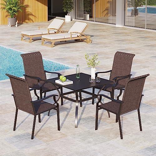 This patio dining set combines comfort and functionality, making it an excellent addition for any outdoor space. Featuring a robust square table with a 1.57-inch umbrella hole, it provides perfect shade options for dining outdoors. The four swivel chairs are crafted from high-quality all-weather Textilene fabric that is breathable, waterproof, dirt-resistant, and easy to clean. With an ergonomic high-back design measuring 42 inches, customers can enjoy exceptional back support while seated. The heavy-duty wrought iron frame ensures stability and can support a considerable weight, making it suitable for family gatherings or casual get-togethers with friends.
