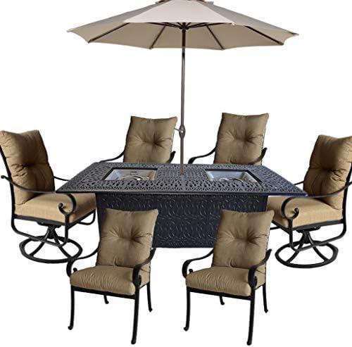 This outdoor dining set is an excellent choice for those looking to elevate their patio experience. Featuring a beautifully designed double burner table and nine complementary pieces, it includes four dining chairs, two swivel rockers, and a 9 ft market umbrella with a sturdy 50 lbs base. The dining table dimension of 44″ x 84″ provides ample space for meals, while the high-quality sesame-colored seat cushions add both comfort and sophistication. Constructed from heavy-duty cast aluminum, it is 100% rust-free and comes with a durable five-stage powder-coated finish that assures longevity and low maintenance.