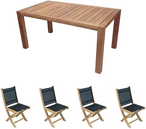 This elegant outdoor dining set is designed to enhance any patio or garden space. Crafted from premium plantation-harvested teak, the table features a stunning 63-inch rectangular design that combines durability and style. The natural high oil content of the wood not only offers remarkable resistance to the elements, ensuring longevity, but it also gives a sophisticated appearance with its clean lines. The inclusion of a 2-inch umbrella hole allows for shade on sunny days, while mortise and tenon joints maintain a strong and sturdy construction. Completing this set are four Sailmate folding chairs, which provide exceptional comfort with their black sling seats and backs, making them perfect for extended outdoor dining or relaxation.